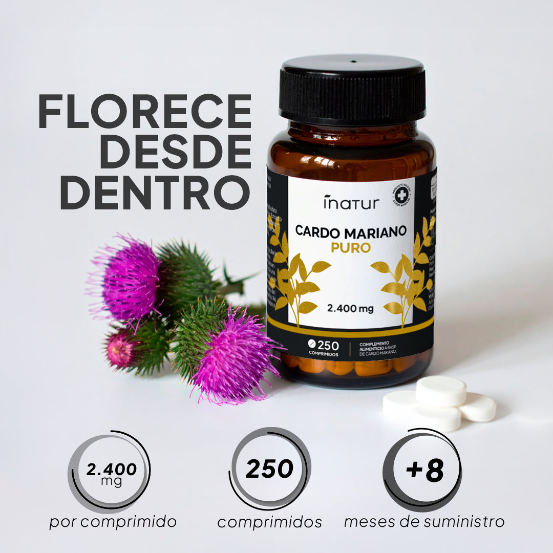 - 🧾 Características principales 🔸 Alta concentración: 2000 mg de extracto de Cardo Mariano (Silybum marianum) por comprimido, con un 80% de silimarina. 🔸 Formato práctico: 250 comprimidos, para más de 8 meses de uso (1 comprimido diario). 🔸 Fórmula apta para veganos: Sin gluten, sin OGM, sin estearato de magnesio ni aditivos innecesarios. 🔸 Fabricado con calidad garantizada: Bajo estándares estrictos y certificaciones como GMP y HACCP.