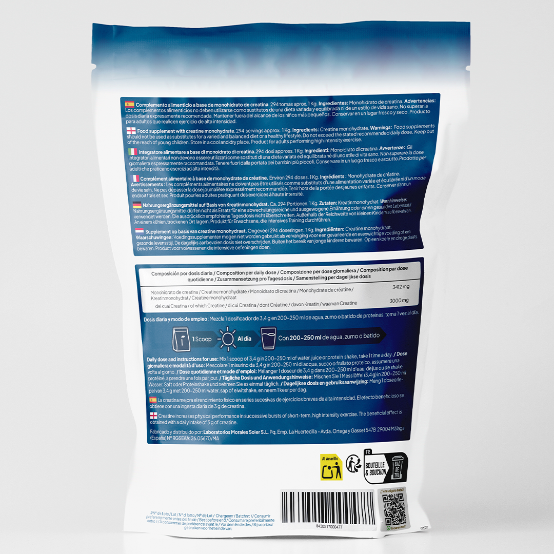 - 🌟 100% Creatina Monohidrato. La creatina monohidrato micronizada en polvo destaca por su alta biodisponibilidad y excelente solubilidad, gracias a una granulometría de 200 mesh. Esta textura ultrafina permite una fácil disolución en agua, zumos, batidos de proteínas o leche.